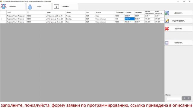 https://kursovik.com/programming/101450484.html Программа расчёта коммунальных услуг по водоснабжению. Есть человек (ФИО) к нему привязывается адрес проживания и ЛС. К ЛС привязывается: количество куб.метров воды хол, гор за месяц. Цена за куб м. Воды Сальдо за начало и конец месяца скрины примера в вложении. Среда разработки: Visual Studio. Технология разработки: WindowForms. Среда программирования: Visual C# .NET 2019. База данных: MS SQL Server 2019. Приобрести исходники(все файлы проекта) данной программы Вы можете, заполнив следующую форму: https://kursovik.com/programming/101450484.html?camefrom=rutube#form Заказать отчёт(описание): https://kursovik.com/programming/101450484.html?camefrom=rutube#pz_need Заказать модификацию: https://kursovik.com/uniform.html?modify=101450484&camefrom=rutube Заказать новую программу: https://kursovik.com/programming_order.html?camefrom=rutube Задать вопрос автору: https://kursovik.com/programming/101450484.html?camefrom=rutube#vopros Наш Телеграм-БОТ для поиска готовых работ по программированию https://t.me/kursovikcom_bot , в нашей базе более 5и тысяч готовых работ, для более эффективного поиска используйте наш Телеграм-БОТ. Список наших готовых работ по программированию: https://kursovik.com/progtopic.html?camefrom=rutube Разработка программ на заказ согласно Вашему заданию: https://kursovik.com/programming_order.html?camefrom=rutube Мы пишем программы практически на всех языках программирования, работаем с различными базами данных, выполняем как мелкие задачки, так и крупные проекты. Разрабатываем и запускаем в работу ЧАТ-БОТы. Обращайтесь - всегда будем рады Вам помочь! Если нужно переписать данную программу на другой язык программирования - обращайтесь - сделаем. Адрес нашего сайта: https://kursovik.com Наши контакты: https://kursovik.com/contacts.html Наша группа ВК: https://vk.com/kursovik (всем подписчикам скидка 5%) Наш Телеграм-канал: https://t.me/kursovik (всем подписчикам скидка 5%) Наш Дзен-канал: https://dzen.ru/kursovik (всем подписчикам скидка 5%) Наш RuTube-канал: https://rutube.ru/channel/41864889 (всем подписчикам скидка 5%) Наш YouTube-канал: https://youtube.com/@kursovik_com (всем подписчикам скидка 5%) (скидки не суммируются :-) #курсоваяработа #базыданных #visualstudio #программирование