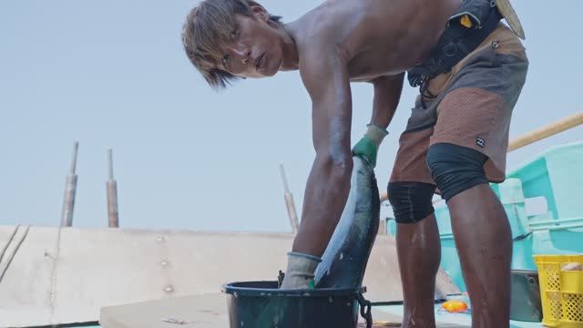 Японские моряки едят тунца под пивко.