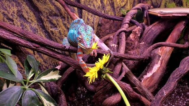 Пантеровый хамелеон( Furcifer pardalis) с удовольствием ест одуванчик.Хамелеону нужны витамины ,ведь в природе они едят фрукты и растения.Естественно это не основной корм,но изредка можно и побаловать.