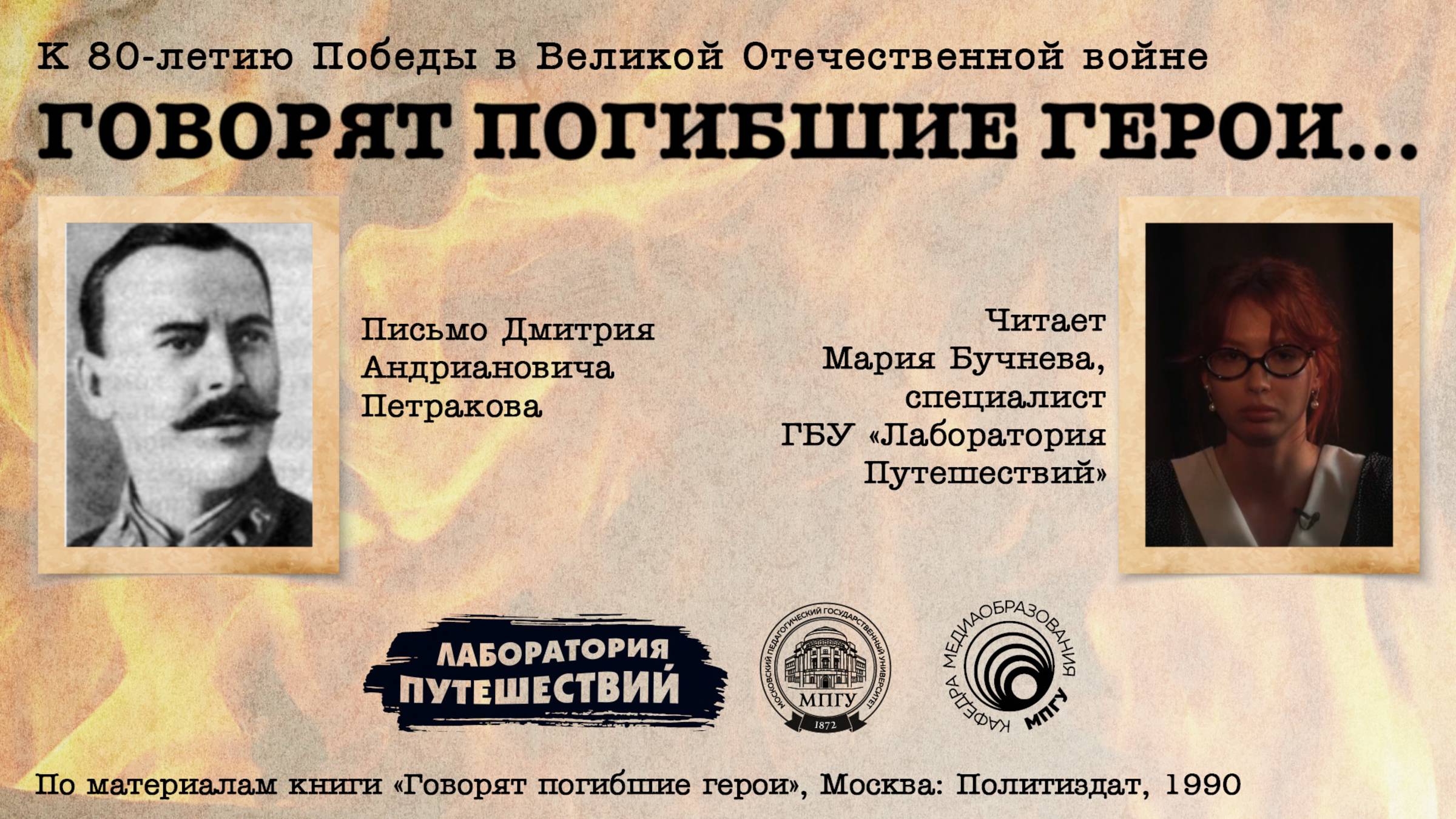 “Говорят погибшие герои”... Проект, посвященный 80-летию Победы в Великой Отечественной войне. За каждой историей стоят живые люди, герои, которые отдали жизнь за мирное небо, за своих жен, матерей и детей. Понимая, что могут не вернуться из самого страшного боя или фашистских застенков, они писали письма и записки родным, стараясь передать им надежду и веру. Благодаря голосам, звучащим сквозь строки, память об их подвиге останется навсегда. Дмитрий Андрианович Петраков до войны преподавал в техникуме в Ульяновске, а потом добровольно ушел на фронт, где показал себя как отважный комиссар полка и агитатор. За смелую вылазку в тыл врага он был награжден орденом Красной Звезды. Летом 1943 года во время наступления на Орел он повел солдат в бой и пал смертью храбрых. Читает Мария Бучнева, специалист ГБУ “Лаборатория путешествий”. Представляем вам совместный проект МПГУ и ГБУ “Лаборатория путешествий”. Производство – #проПоходТВ. Группа ВКонтакте МПГУ: https://vk.com/kafedra_media ГБУ “Лаборатория путешествий”: https://vk.com/goulp Канал о туризме #проПоходТВ: https://vk.com/club226767525 #СловоГероям #9мая #80летПобеде #МПГУ #ЛабораторияПутешествий #проПоходТв