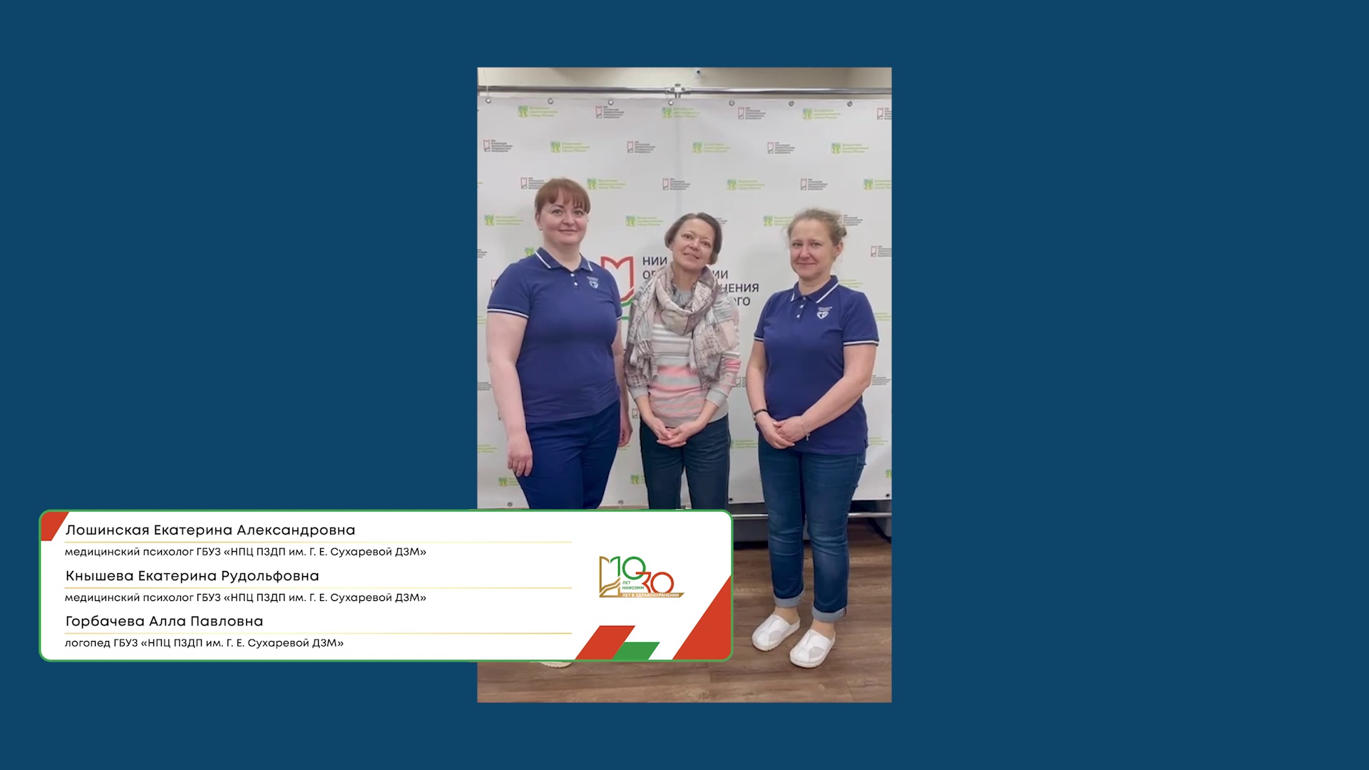 Лошинская Екатерина Александровна - Медицинский психолог ГБУЗ «НПЦ ПЗДП им. Г.Е. Сухарева ДЗМ» Кнышева Екатерина Рудольфовна - Медицинский психолог ГБУЗ «НПЦ ПЗДП им. Г.Е. Сухарева ДЗМ» Горбачева Алла Павловна - Логопед ГБУЗ «НПЦ ПЗДП им. Г.Е. Сухарева ДЗМ»