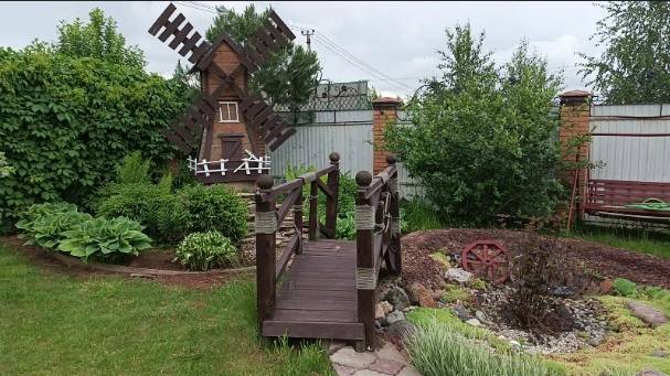 Мельница,мостик и сухое озерко. Дизаяйн сада.