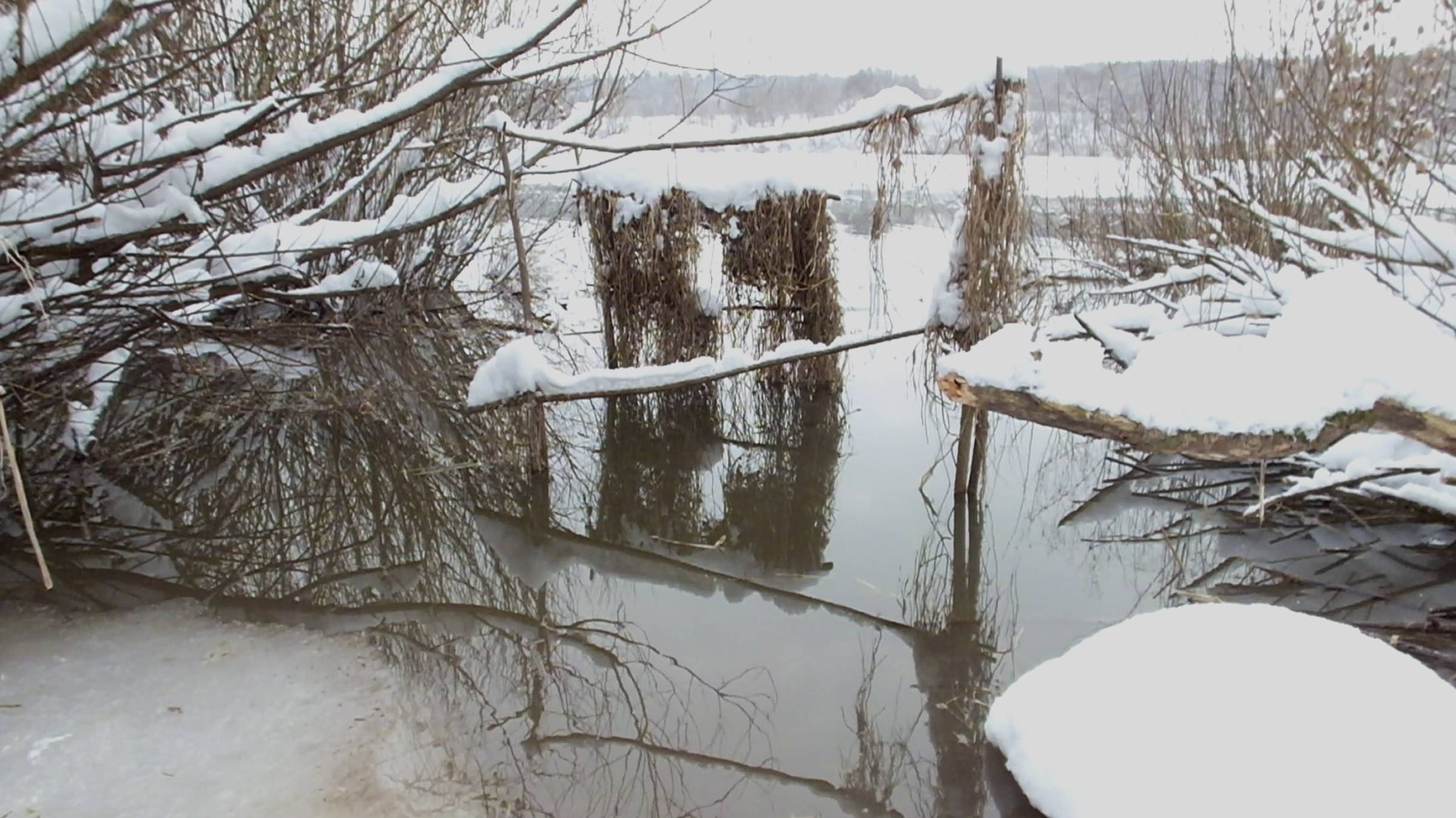 Что собой представляет укрытие «ШИРМА»? Вбиваю два кола. К ним привязываю шесты. К шестам привязываю поперечные палки. На них навешиваю «веники» из осоки. С собой приношу кусок тонкого брезента для крыши от возможных осадков и от глаз бдительных сорок, которые могут предупредить уток об опасности. Позже ширму переставлять выше по склону пришлось ещё три раза.