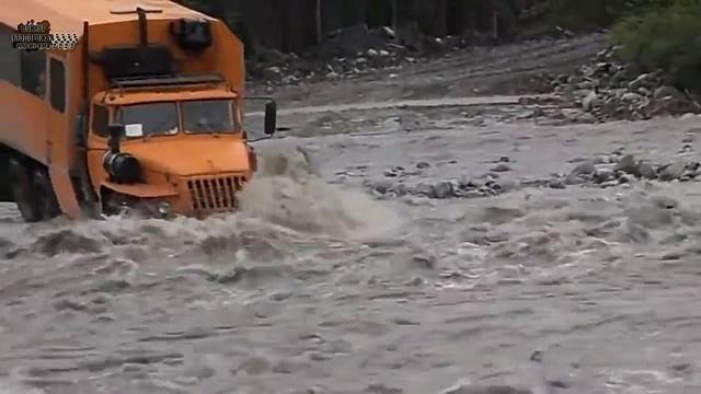 Не какого комфорта, но за то проходимая, грузовик Урал Вахтовка через бурлящая реку.