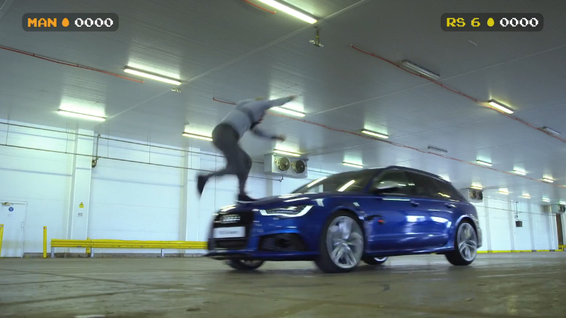 В видео происходит дуэль между новой RS 6 Avant и человеком, когда оба участника пытаются попасть друг в друга шариками с краской.
