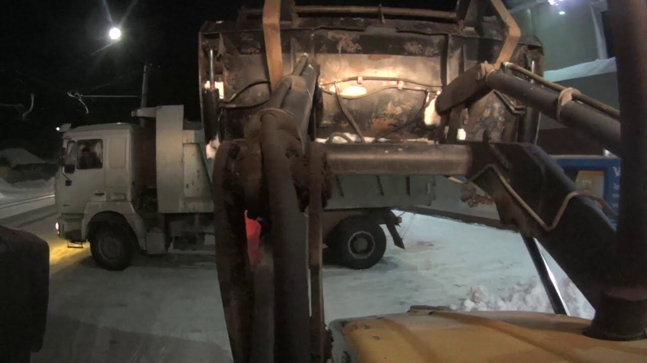 "Дети лезут под колёса" Работа в морозы. Люди. Снег. Погрузка. Экскаватор-погрузчик САТ + MAN