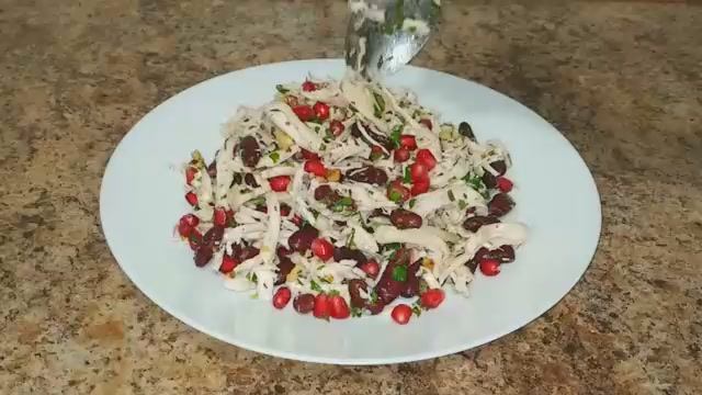 Рецепт куриная грудка - 400 г; фасоль - 200 г; зерна граната - 150 г; грецкие орехи - 70-80 г; кинза - хороший пучок (можно укроп). Заправка растительное масло - 4-5 ст. л.; сухой чеснок - 1 ч. л.; соль, перец - по вкусу.