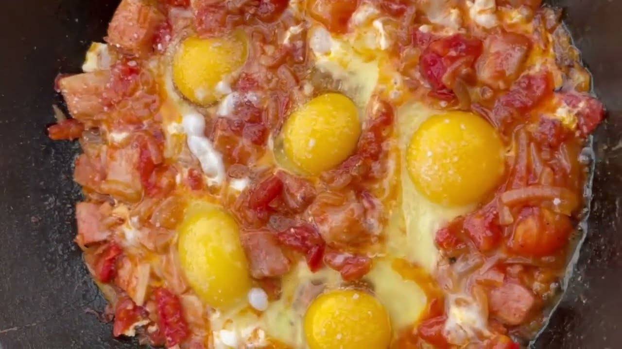 ШАКШУКА ПО ДЕРЕВЕНСКИ В ЧУГУННОЙ СКОВОРОДЕ НА ОГНЕ