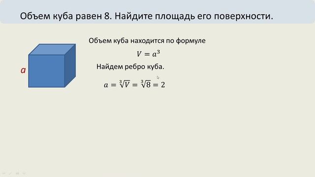 Объем куба равен 8. Найдите площадь его поверхности