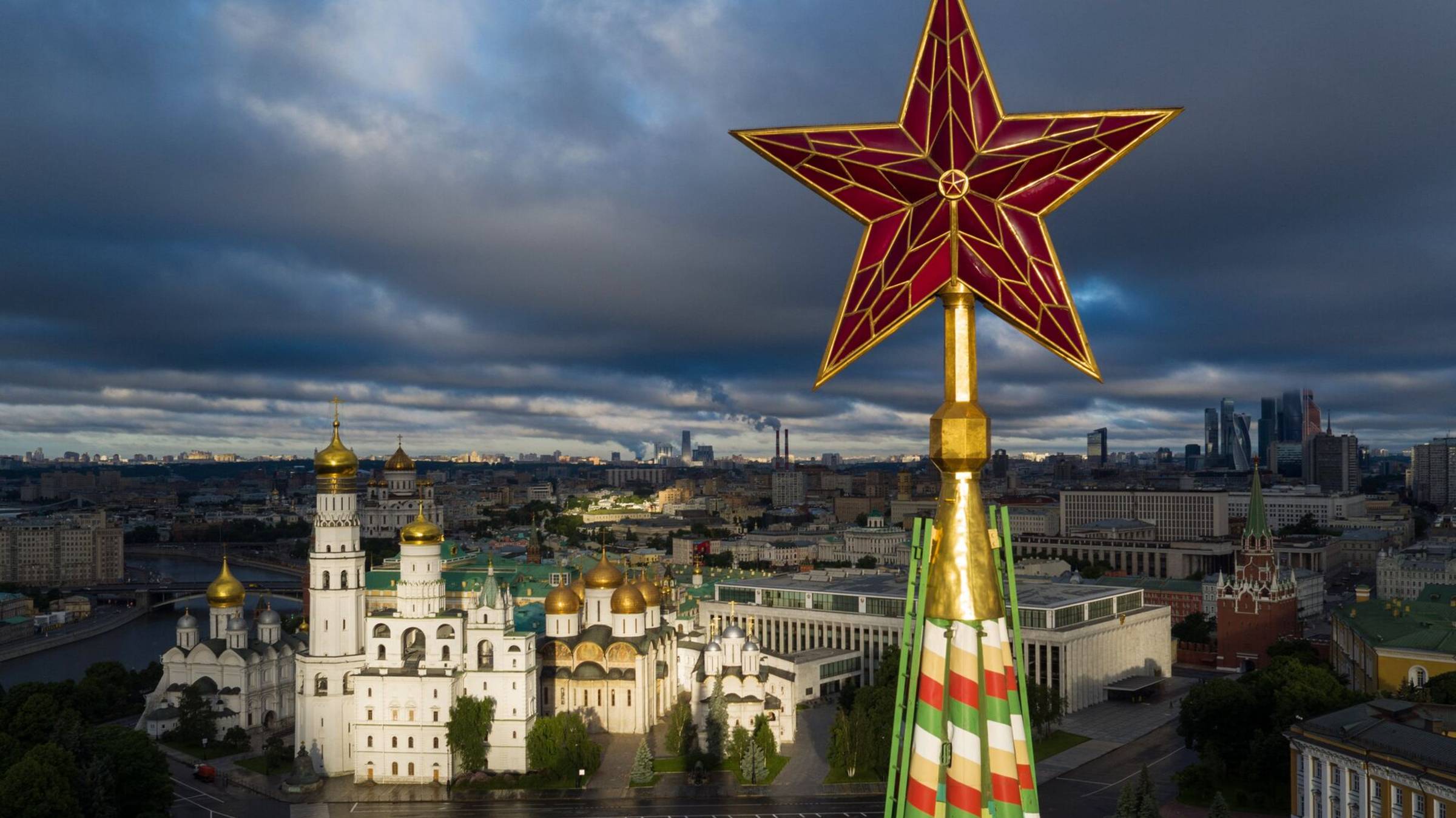 Первая пятиконечная звезда на Спасской башне Московского Кремля