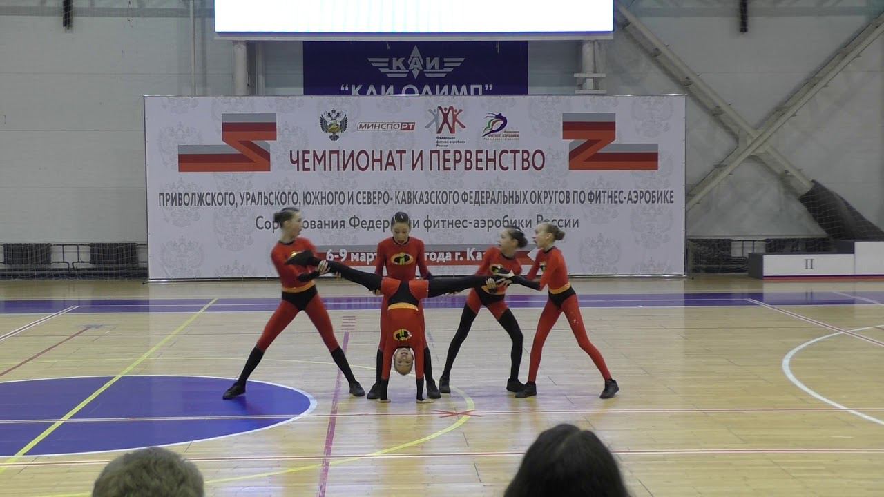 Аэробика (5 человек). Юноши-девушки 11-13 лет. Соревнования Первенства Приволжского, Южного, Северо-Кавказского и Уральского федеральных округов по фитнес-аэробике в 2020 году. РТ, г. Казань, ул. Чистопольская, 67, КСК "КАИ Олимп" 06-09 марта 2020 г. Тренер - Власова Олеся Владимировна.