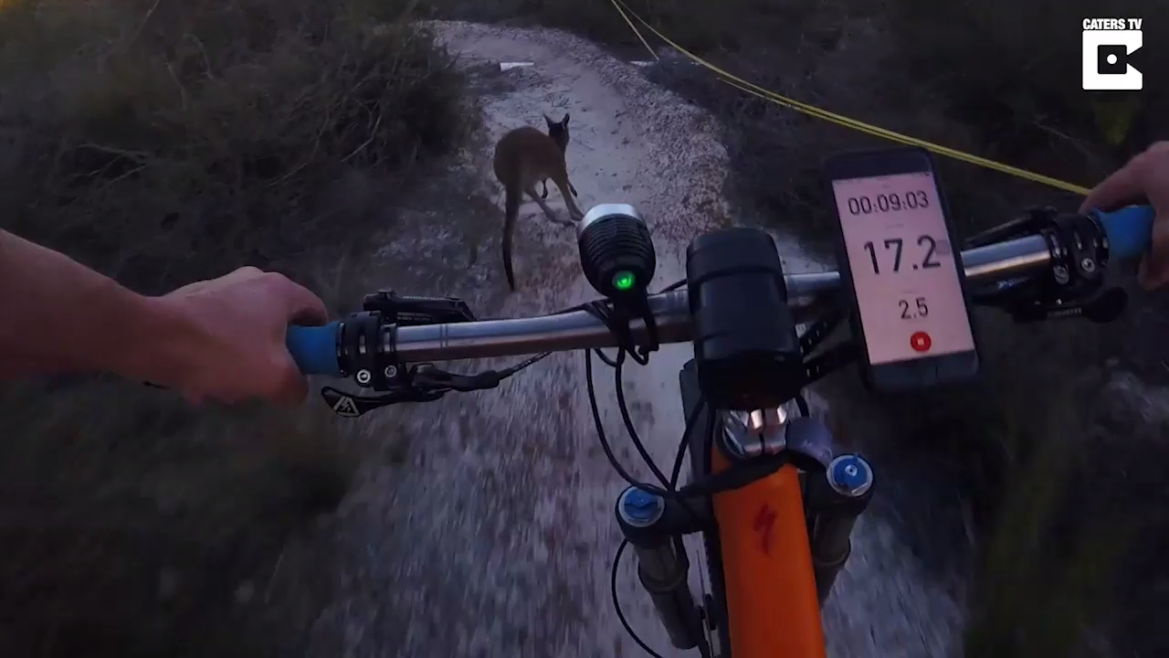 Велосипедист соревнуется с кенгуру в скорости преодолевания дороги на пересеченной местности ) #кенгуру #гонки #велосипед