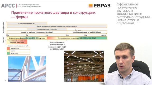 Докладчик Александр Бибин, руководитель направления по расчету металлоконструкций ООО «ЕвразХолдинг» Программа вебинара включает 4 части: 1. История формы двутавра Краткий исторический очерк из истории технологии проката, а также базовый принцип формы двутавра, определяющий условия его применения в строительных конструкциях. 2. Сегменты рынка с точки зрения применения двутавра Сегменты рынка, в которых очевидны преимущества применения двутавра, а также отдельные области применения внутри этих сегментов. Реальные кейсы проектирования и необычные подходы с точки зрения применения двутавра, в том числе повышенной прочности в сегментах мостового строительства, крупной промышленности, одноэтажных зданий, а также в области коммерческой и офисной недвижимости. 3. Оптимальность и рациональность применения двутавра Способы поиска оптимального решения не только в области снижения массы конструкций, снижение стоимости изготовления через снижение отхода и сокращение сроков монтажа. 4. Расширение сортаментной линейки и новые стали как один из путей оптимизации решений Актуальные изменения в сортаменте двутавра, расширение линейки освоенных и доступных на рынке профилей, нюансы корректного наименования двутавровых позиций по ГОСТ, формирование заказа на покупку металлопроката, в том числе из сталей повышенной прочности.