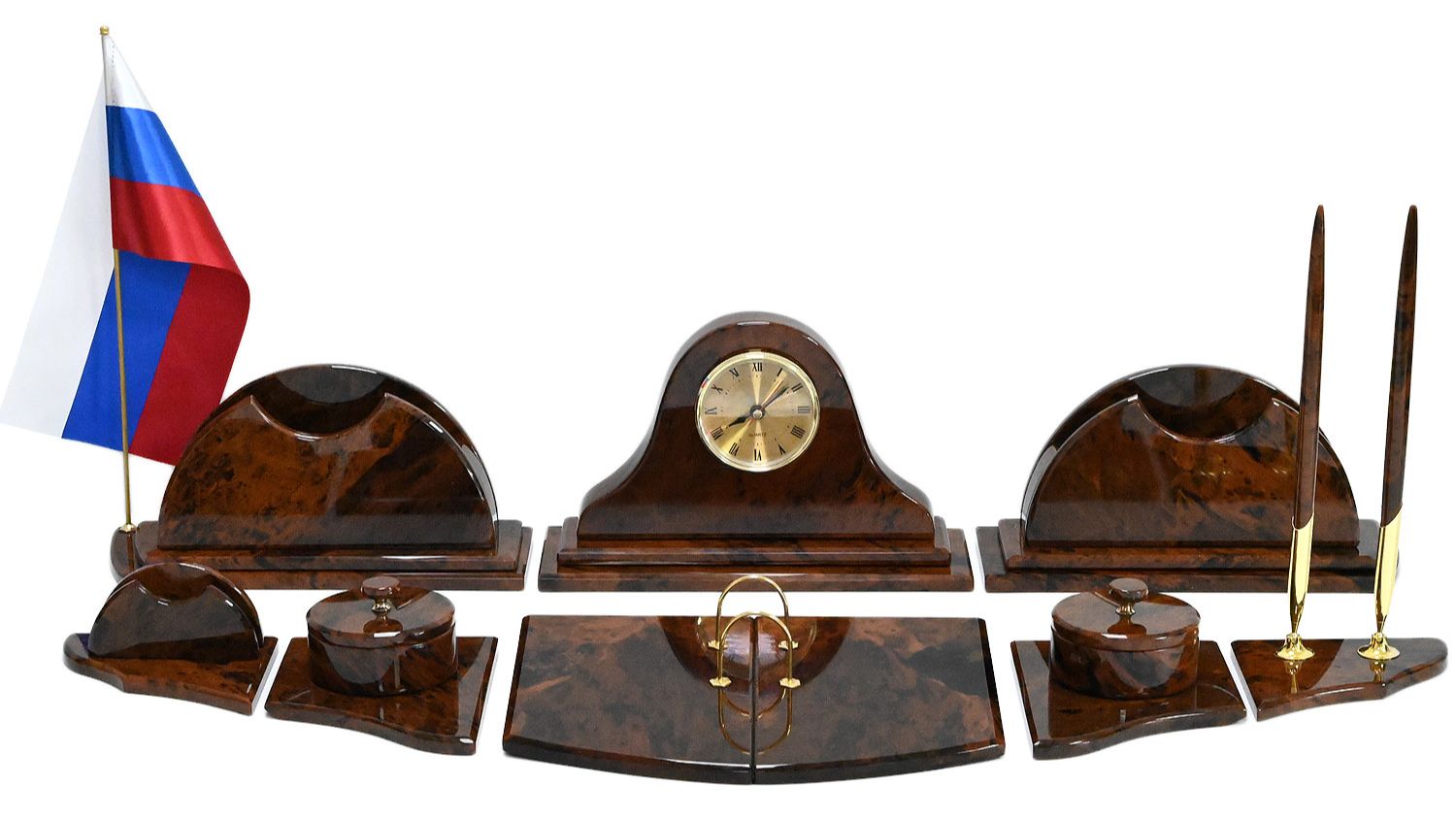 •Материал: обсидиан, кварцовый механизм, бархат, латунь. •Техника исполнения: камнерезные работы. •Размеры: при плотной компоновке на столе 720*275*160мм. - Часы 215*70*140мм-1шт. - Основание под часы 240*90*10мм-1шт. - Бумажница с карандашницей 220*70*105мм-2шт. - Основание под бумажницу и карандашницу 240*90*10мм-2шт - Визитница 110*100*55мм-1шт. - Подставка с тюльпанами 110*100*10мм-1шт. - Шкатулка на основании 110*150*58мм-2шт. - Календарница 240*180*20мм-1шт. - Ручки: 10*10*200мм-2шт. •Вес брутто: 8,35кг. •При заказе вы покупаете образец, который представлен на видео.
