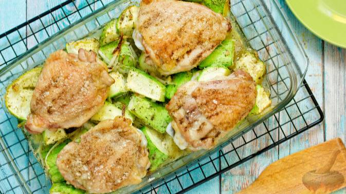 Запечённая в духовке курица, целиком или частями, - это всегда уместное блюдо для семейной трапезы. В этом рецепте куриные бёдра будут запекаться на кабачковой "подушке". А в дальнейшем именно эти кабачки и будут прекрасным гарниром к сочным и вкусным запечённым куриным бёдрышкам. #ЗапеченнаяКурица #КурицаСКабачками #КурицаВДуховке #КабачкиВДуховке