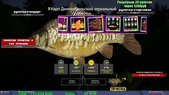 Поддержка донатом https://new.donatepay.ru/@1032463 Альтернативный донат https://www.donationalerts.com/r/kalyamba11 5536913964533059 карта Тинькоф Если стрим лагает,смотри стрим на трово https://trovo.live/s/Kalyamba_na_Ribalke Мой ВК - https://vk.com/kalyantv НИК в игре kalyan11 НАШ ДИСКОРД СЕРВЕР https://discord.gg/3ZeEDGs5h6 Заказ водоема на 1 час - 500р ( весь стрим 2500р ) Модерка на канале 1300р ( каждая следующая на 100р больше) Озвучка доната на 40р,50р,100р,200р,300р,500р,1000р ✅Призы в рулетке "ЗОЛОТАЯ" ✔ ЗОЛОТО ✔ ПРЕМ ✔ КАТУШКИ ЮБИЛЕЙНАЯ БОРЕЛИКА, ВЕНГИ, ТАЙГА, СИЛЬВЕР 80, И другие ✔ ПАЛКИ ПИЛКЕРНАЯ, ДОНКА МОРСКИЕ, ✔ РОД ПОД, СТУЛЬЯ ✅Призы в рулетке СТАНДАРТ : ✔ катушкИ ЮБИЛЕЙНАЯ БОРЕЛИКА, ВЕНГИ, ТАЙГА, СИЛЬВЕР 80, И другие ✔ катушки 60 для медного ( ЭВИИ, НАТОРЫ, ГОЛДА, и тд) ✔ ПИЛКЕРНОЕ УДИЛИЩЕ КОРОЛЕВА ОКЕАНА ✔ Морское Донное удилище ✔ прем ( 3, 7, 30 дней) ✔ золото ( 1, 3, 5, 10, 20 ,50) ✔ билет на море ( 1, 3, 5 дней) ✔ голд наживка и др. ✅Призы в рулетке "СТАРТОВАЯ" ✔ катушка "silver80" ✔ катушка "БЕЛЫЙ КАЛИБР" ✔ катушка "Черный калибр" ✔ катушка "Протон" ✔ катушка "Нарга 6000" ✔ Набор Фидерист и спинингист ✔ Карповик Фортуна ✔ фидерные удилища ✔ прем, золото, алкашка, наживки и тд P.s Рулетка это не казино, а награда за поддержку стримера. Вечный ТОП ПОДДЕРЖКИ (11.05.2024) 1. Dimon_pokemonchik 119 784 2. Interceptor 75 508 3. Skreb79 71 261 4. une personne 68 619 5. Нарвал77 31 550