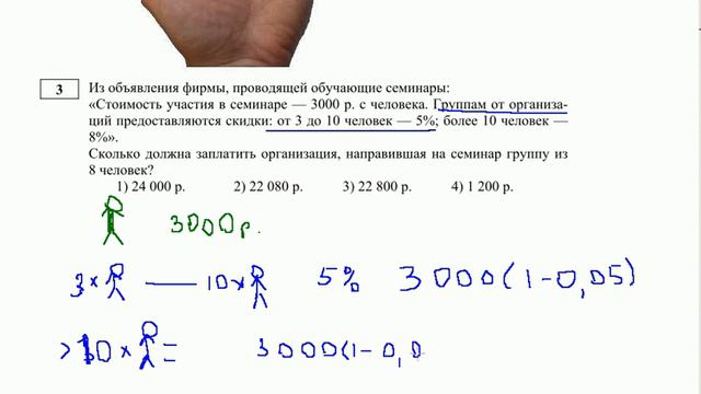 Из объявления фирмы, проводящей обучающие семинары: «Стоимость участия в семинаре — 3000 р. с человека. Группам от организа- ций предоставляются скидки: от 3 до 10 человек — 5%; более 10 человек — 8%». Сколько должна заплатить организация, направившая на семинар группу из 8 человек? 1) 24 000 р. 2) 22 080 р. 3) 22 800 р. 4) 1 200 р.