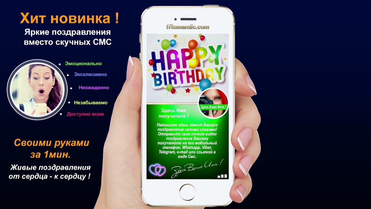 ЗАПОЛНИТЬ ЭТУ ОТКРЫТКУ СЕЙЧАС: https://1romantic.com/musicalnye-pozdravleniya/schastya-tebe/ Дорогие друзья! Вам остаётся только, написать нужный вам текст и загрузить свою фотографию. 1Romantic.com Является первым и единственным в мире сервисом интерактивных видео поздравлений. Мы используем собственную уникальную технологию, добавляя ежедневно самые новые и последние разработки программирования. У нас Вы можете найти поздравления на любой вкус, только высокого качества и разрешения. Согласитесь, всегда приятней, отправить поздравления от себя лично, чем пересылать чужие, с уже заготовленным стандартным и быстро мерцающим текстом, как рекламный баннер, пересылаемый друг-другу от тысячи к тысячам где нет Ваших Имён. Задумайтесь ! Это выглядит слишком наивно и как минимум глупо, особенно для людей которые умеют писать и читать (на мою розочку сверкалку или стикер и отвали). Теперь всё будет иначе ! Вы можете сами передать своё настроение, тем людям, которым Вы будете адресовать своё поздравление. Теперь Вы сами, творец, художник и поэт своих чувств, наполняя видео открытку своими словами, излучая только самое доброе, искреннее из своих тёплых сердец. Загрузить свою любимую фотографию или фотографию получателя, что безусловно, будет гораздо приятней и неожиданней для него) Безусловно, мы подумали и о музыкальном оформление. Наверняка, Вы будете подбирать нужные слова и фотографию под ту песню, которую Вы захотите загрузить сами, а не ту которую Вам навязывают. Ну и самое главное, Вы можете использовать функцию добавления своего голоса, программа сама наложит Ваш голос на начало загруженной песни. Поверьте это очень оригинально, особенно если Ваш друг не слышал Вас долгие годы. Такое поздравление можно сделать действительно за 30-60 сек. Но если Вы творческий человек, оно не отпустит Вас так быстро))) И Вы будете думать, сочинять, плакать, улыбаться, восхищаться, раскрыв в себе новые таланты... возможно это станет Вашим первым собственноручным творением . Удачи Вам ! С уважением, Ваши Романтики ! Краткий список предлагаемых нами поздравлений... Поздравления с днем рождения женщине. Поздравления с днем рождения мужчине. Поздравления с днем рождения другу. Поздравления с днем рождения подруге. Поздравления с днем рождения для детей. Поздравления с днем святого Валентина. Поздравления Папе. Поздравления с днем рождения Маме. Прикольные поздравления. Видео поздравления с днем рождения. Музыкальные поздравления с днем рождения. Слайд-шоу с днем рождения. и многое-многое другое.