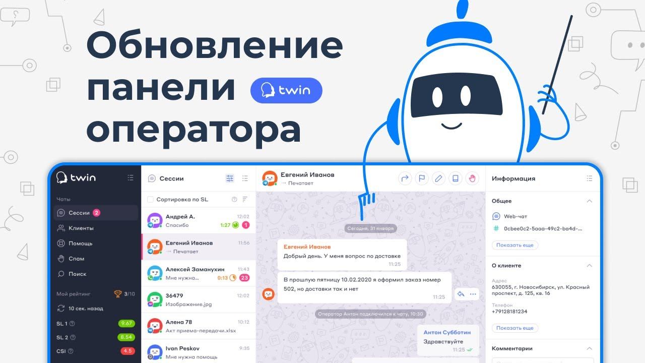 Обновленный дизайн, новая архитектура, новые функции - все это в обновленной панели оператора TWIN! Платформа для создания ботов TWIN: https://twin24.ai/app Контакты: Сайт: https://twin24.ai/ Телефон: +7(499) 286-83-44 ВКонтакте: https://vk.com/twin24ai Телеграм: https://t.me/TWIN_communication