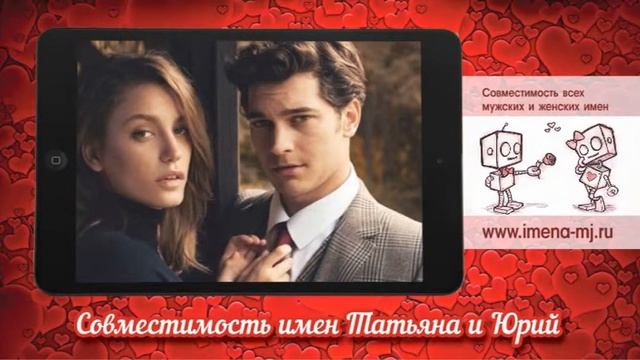 Заходите на наш сайт www.imena-mg.ru там очень много статей совместимости Если Вам не нравится голос робота, можете прочитать статью на сайте https://imena-mj.ru/index.php/9-men/623-%D1%82%D0%B0%D1%82%D1%8C%D1%8F%D0%BD%D0%B0-%D0%B8-%D1%8E%D1%80%D0%B8%D0%B9.html Татьяна и Юрий совместимость подобна небесной идиллии. Многие, кто с ними близко общаются, восхищаются и удивляются, как им удаётся так понимать и чувствовать друг друга? И это не единичный случай, когда Юрий начинает, а Татьяна подхватывает и развивает его мысль... Сайт "Совместимость мужских и женских имен" — https://imena-mj.ru