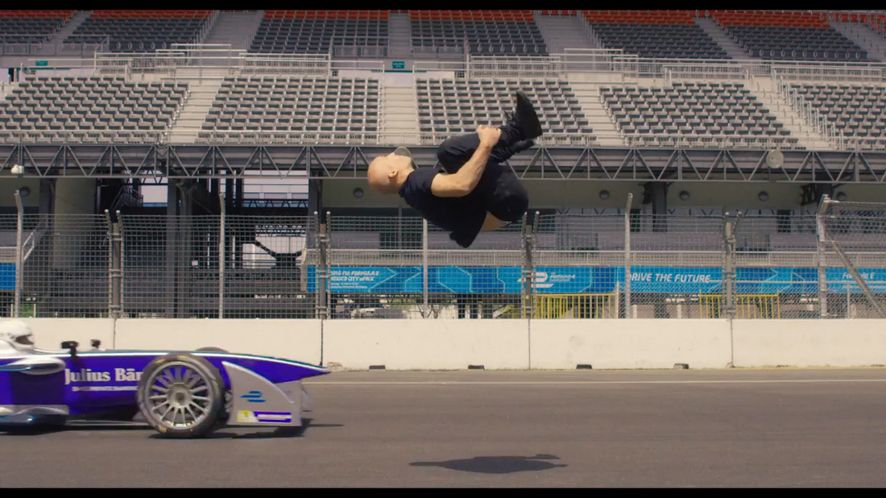 Британский каскадёр Дамьен Уолтерс, известный по спортивной карьере гимнаста и участию в нескольких голливудских фильмах, сделал обратное сальто над проезжающим под ним на огромной скорости электрокаров «Формулы-E».