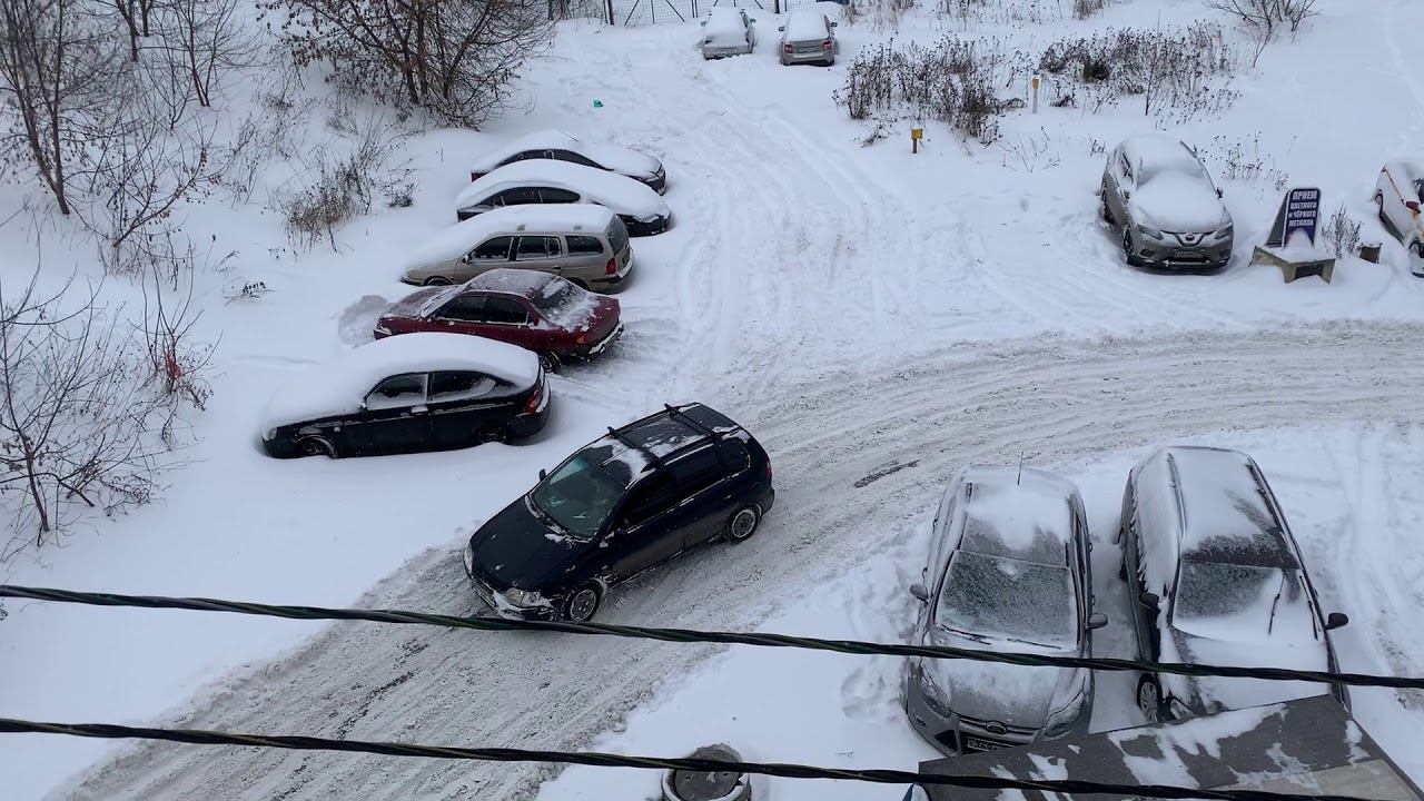 Грузовая Газель против снежной горки. Машины во время снегопада в Москве.