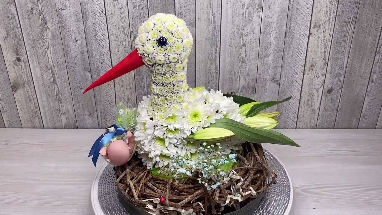 Аист из живых цветов на выписку из роддома. Оригинальные букета на выписку из роддома https://ranunculus.ru/podarki-na-rozhdenie-rebenka/bukety-na-vypisku-iz-roddoma/ Сайт https://ranunculus.ru