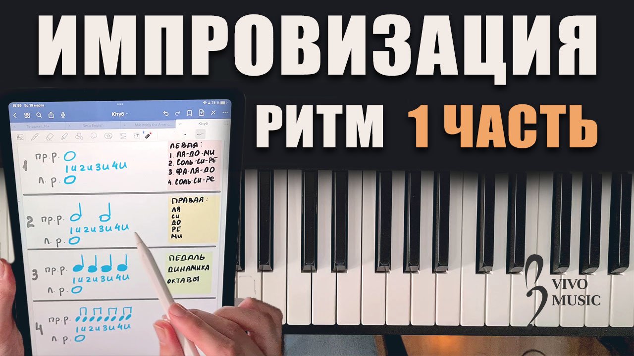 Учимся играть ритмично, координировать руки и импровизировать. Используем базовые длительности: целые, половинки, четверти и восьмые. Для начинающих пианистов. (Нажимайте "ещё", чтобы раскрыть описание с заметками) ?Совет: не торопитесь, прорабатывайте каждый шаг очень вдумчиво и качественно. ?Задача: вбить в руки шаблоны, чтобы автоматически их использовать в дальнейшем. "Голова понимает быстрее рук, рукам нужно время". Желаю вдохновения и удовольствия? ❗Рекомендую считать вслух, чтобы действительно был результат. Если под рукой нет инструмента, простукивайте ритмы на столе / на коленках. 00:00 - Вступление 00:26 - Трезвучия для левой руки 1. Ля минор - ля, до, ми 2. Соль мажор - соль, си, ре 3. ФА мажор - фа, ля, до 4. Соль мажор - соль, си, ре Пальцы: 1-3-5 01:50 - Ритм в левой руке. Целые длительности 03:15 - Ритм в правой руке №1. Целые длительности Ноты в правой: ля (1 палец), си (2 палец), до (3), ре (4), ми (5). 04:59 - Гармоничное сочетание нот 05:59 - Ритм №2. Половинные длительности 07:35 - Ритм №3. Четверные длительности 08:23 - Добавляем педаль 09:44 - Ритм №3. Считаем самостоятельно 10:39 - Ритм №4. Восьмые длительности 12:45 - Не торопитесь. Как можно играть восьмые 14:02 - Объединяем длительности (Целые, половинки, четверти, восьмые) Пример со счётом вслух 16:53 - Объединяем длительности (Половинные, четверти, половинные, восьмые) Пример без счёта 18:57 - Напутствие. Зачем нужно "вбивать в пальцы" разные ритмы 19:57 - Импровизация по мотивам этого видео ______________________________________________________ Давайте общаться: Instagram – https://www.instagram.com/iva.vivo/ Telegram – https://t.me/ivavivo Больше обо мне и запись на занятие: http://vivo-music.ru/ #ivavivo #vivomusic #длительности #ритмпианино #импровизацияпианино #начинающиепианисты