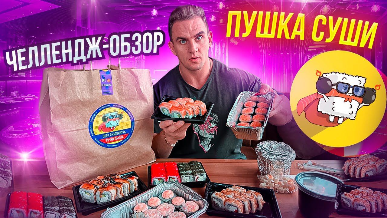 Челлендж-ОБЗОР. ПУШКА СУШИ. Паназиатская кухня. Пицца. Суши. Роллы. Мукбанг.