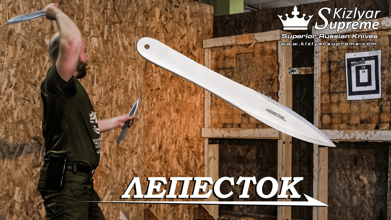 Метательный нож Лепесток разработан В. Ковровым. С 2015 года производится на заводе Kizlyar Supreme. Относится к ножам кинжального типа. Отлично подходит для метания спортивной, свободной и безоборотной техниками. Отличается точностью и стабильностью, особенно на дальних дистанциях. Нож сертифицирован и не относится к холодному оружию. Подробнее http://www.kizlyarextreme.ru/mietatielnyie-nozhi/liepiestok?cPath=93_188 http://kizlyarsupreme.ru/index.php?main_page=product_info&products_id=299