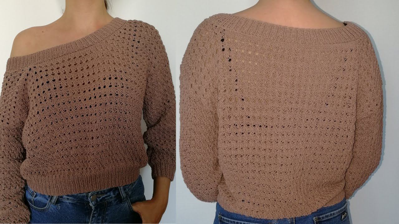 Свитер кофейного цвета летний суперлегким узором спицами. Подробный мастер-класс