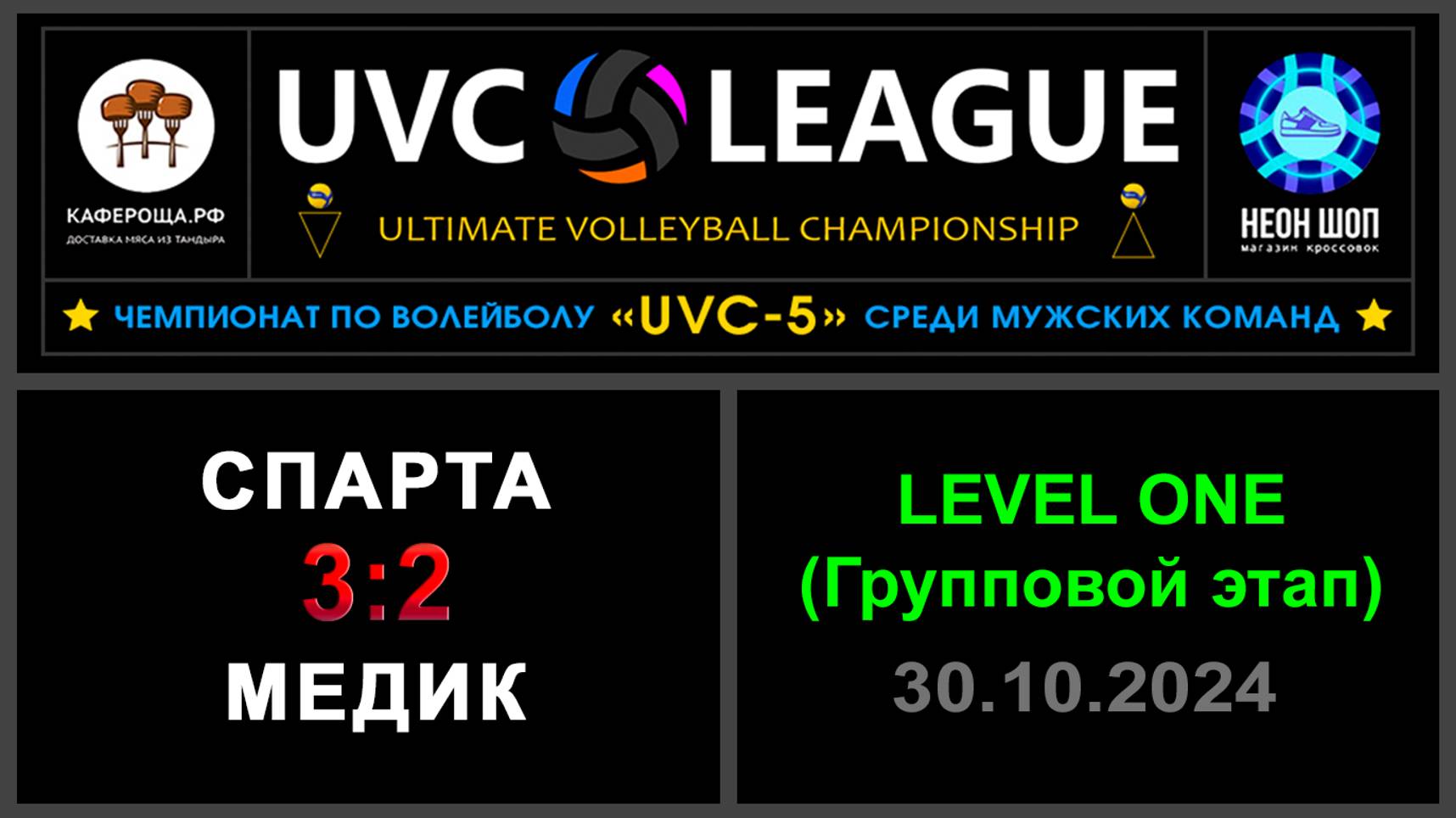 UVC-5 (Мужчины): Чемпионат UVC Лиги по волейболу среди мужских команд, 2024-2025 гг. Результаты игры: LEVEL ONE (Групповой этап) 30.10.2024 Спарта - Медик 3:2 (25:12, 25:17, 21:25, 23:25, 15:11) ✅Медик прошел в следующий этап конкурса «РЕШАЛА»! ⛔В конкурсе «Робин Гуд» точных попаданий не было! #UVC_ЛИГА_ЧЕМПИОНАТ_UVC_5_Мужчины