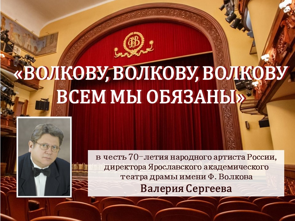 Центральная библиотека имени М. Ю. Лермонтова представляет видеопрезентацию «Волкову, Волкову, Волкову всем мы обязаны», в честь 70-летия народного артиста России, директора Ярославского академического театра драмы им. Ф. Волкова Валерия Валентиновича Сергеева. Свой необыкновенный актёрский талант Сергеев посвятил единственному театру в России - Волковскому, и отдал ему 35 лет жизни.