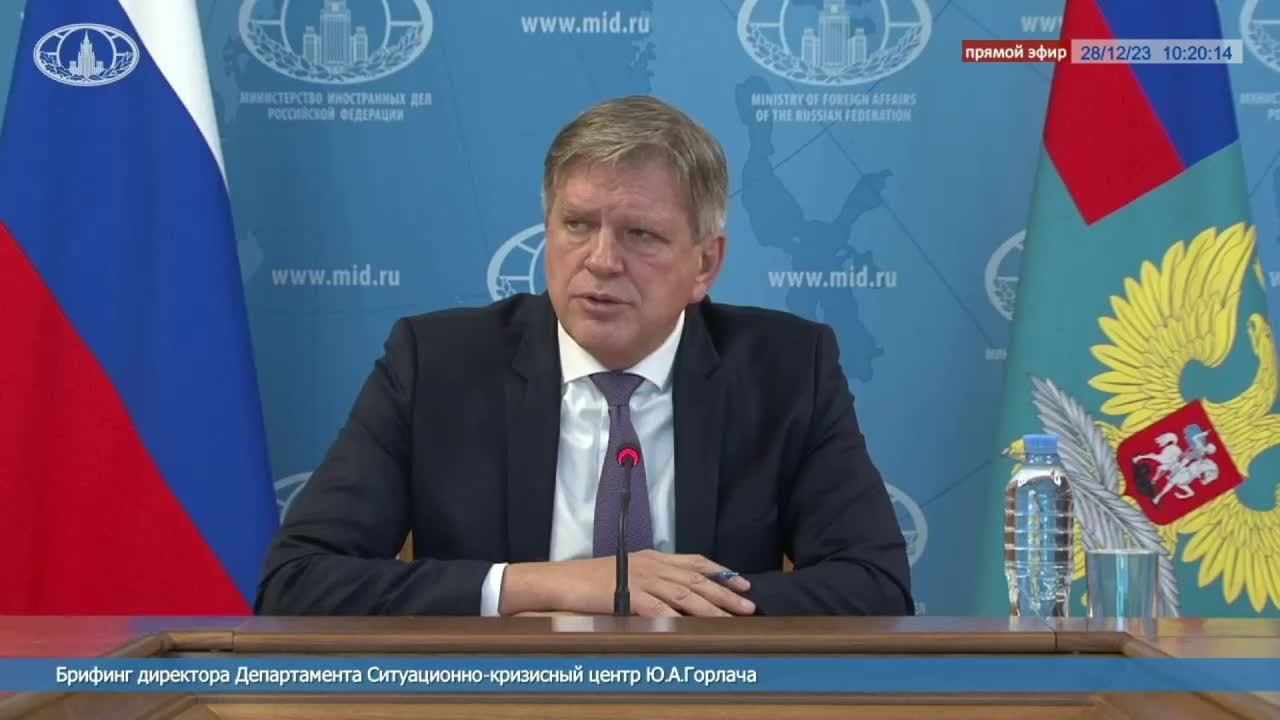Брифинг директора ДСКЦ МИД России Ю.А.Горлача об итогах эвакуации граждан России из сектора Газа, а также по другим направлениям деятельности Департамента в 2023 году