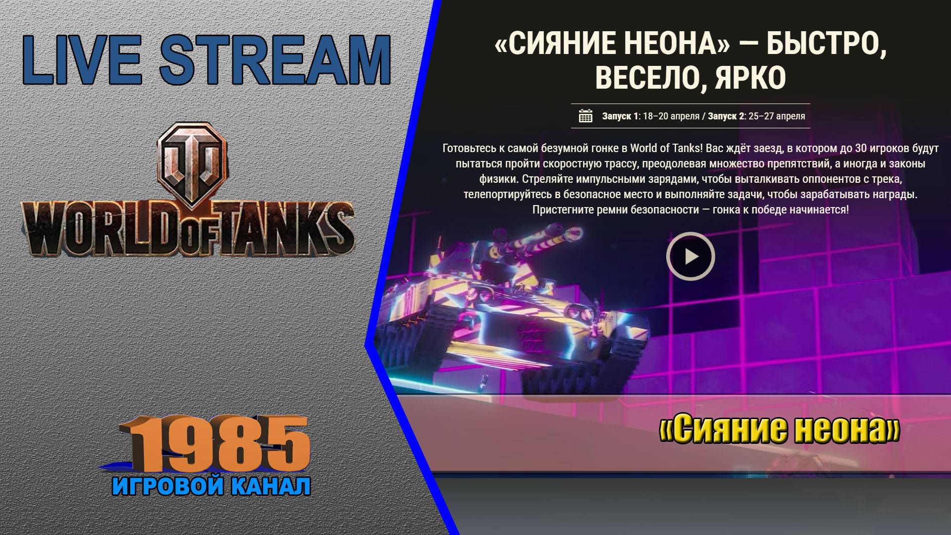 ✅ World of Tanks●1.28.1●Stream 18/04/2025 ✅«Сияние неона» Запуск 1: 18–20 апреля / Запуск 2: 25–27 апреля Готовьтесь к самой безумной гонке в World of Tanks! Ваc ждёт заезд, в котором до 30 игроков будут пытаться пройти скоростную трассу, преодолевая множество препятствий, а иногда и законы физики. Стреляйте импульсными зарядами, чтобы выталкивать оппонентов с трека, телепортируйтесь в безопасное место и выполняйте задачи, чтобы зарабатывать награды. Пристегните ремни безопасности — гонка к победе начинается! ✅Мы на других платформах: 📌https://t.me/+6RsxIIStwL0xZWIy 📌https://dzen.ru/1985games 📌https://vk.com/games_stream1985 📌https://www.twitch.tv/gamesstream1985 📌https://rutube.ru/channel/774539/ ●▬↓ПРЕЖДЕ ЧЕМ ЗАДАТЬ ВОПРОС - РАЗВЕРНИ МЕНЯ И ПОСМОТРИ!↓▬● ▬▬▬▬▬▬▬▬▬▬▬▬▬▬▬▬▬▬▬▬▬▬▬▬▬▬▬▬▬▬▬▬▬▬▬▬▬▬ 💲💲 💲●ДОНАТ●💲💲💲 💲Поддержать голосовым сообщением (задать вопрос или написать пожелание в прямой эфир) от 10р DONATIONALERTS https://www.donationalerts.com/r/1985_gaming_channel QiwiDONAT https://donate.qiwi.com/payin/GAMES_STREAM ▬▬▬▬▬▬▬▬▬▬▬▬▬▬▬▬▬▬▬▬▬▬▬▬▬▬▬▬▬▬▬▬▬▬▬▬▬▬ #WorldofTanks #1_28_1 #1985_stream
