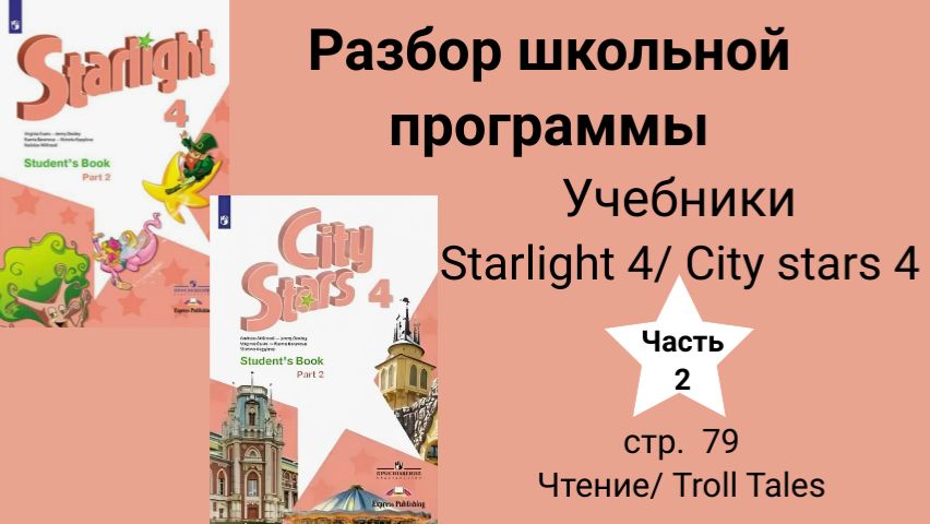 Поблагодарить автора и осуществить перевод донатов можно на сайте https://taplink.cc/liubov.swan Курс для школьников (Обучение чтению на английском через мнемотехнику). Ознакомиться и приобрести можно на сайте https://taplink.cc/liubov.swan Сообщество "Английский через мнемотехнику/ Любовь Свон" https://vk.com/english_swan Инстаграм https://www.instagram.com/p/CkipZv2ID_b/?igshid=NTdlMDg3MTY= Данное видео носит обучающий, ознакомительный характер и предназначено для детей, которые учатся в 4 классе по УМК Starlight 4 (2 часть) и для родителей. Приведен подробный разбор учебника на Starlight 4 | City stars 4 (Старлайт 4), учебник(часть 2), стр 79. Чтение Troll Tales/ истории троллей Учебник Английский язык. 4 класс: учеб. для общеобразоват. учреждений и шк. с углубл. изучением англ. яз. В 1 ч. Ч. 1 / [К.М. Баранова, Д. Дули, В.В. Копылова и др.]. - М. : Express Publishing : Просвещение, 2011 год. - 136.: ил. - (Звёздный английский). - ISBN 978-5-09-018712-1. Источник 11 классов. Портал школьных пособий. URL: https://pdf.11klasov.net/