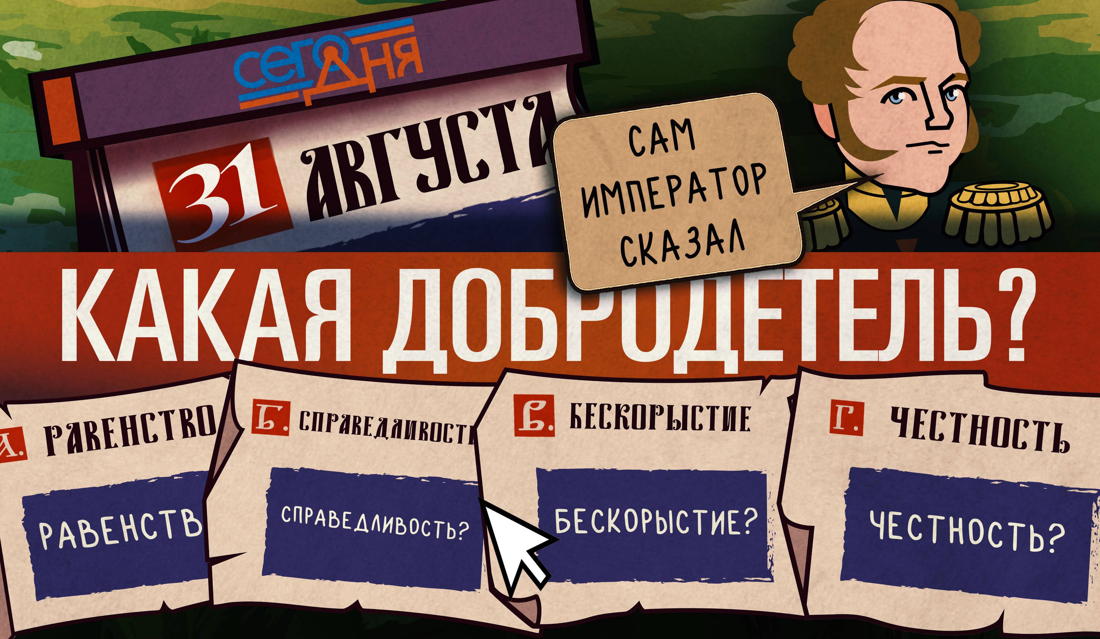 Сегодня последний день лета, а поэтому и дата соответствующая —День шепота травы. Самое время прислушаться, о чем же говорит трава перед холодами. Какая добродетель была провозглашена императором Александром I основным принципом внешней политики? Отгадай, что случилось «Сего дня»!