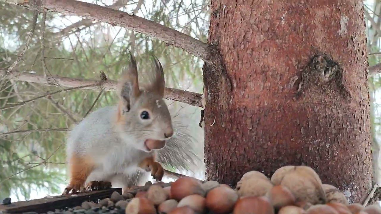 Белка прячет фундук из кормушки