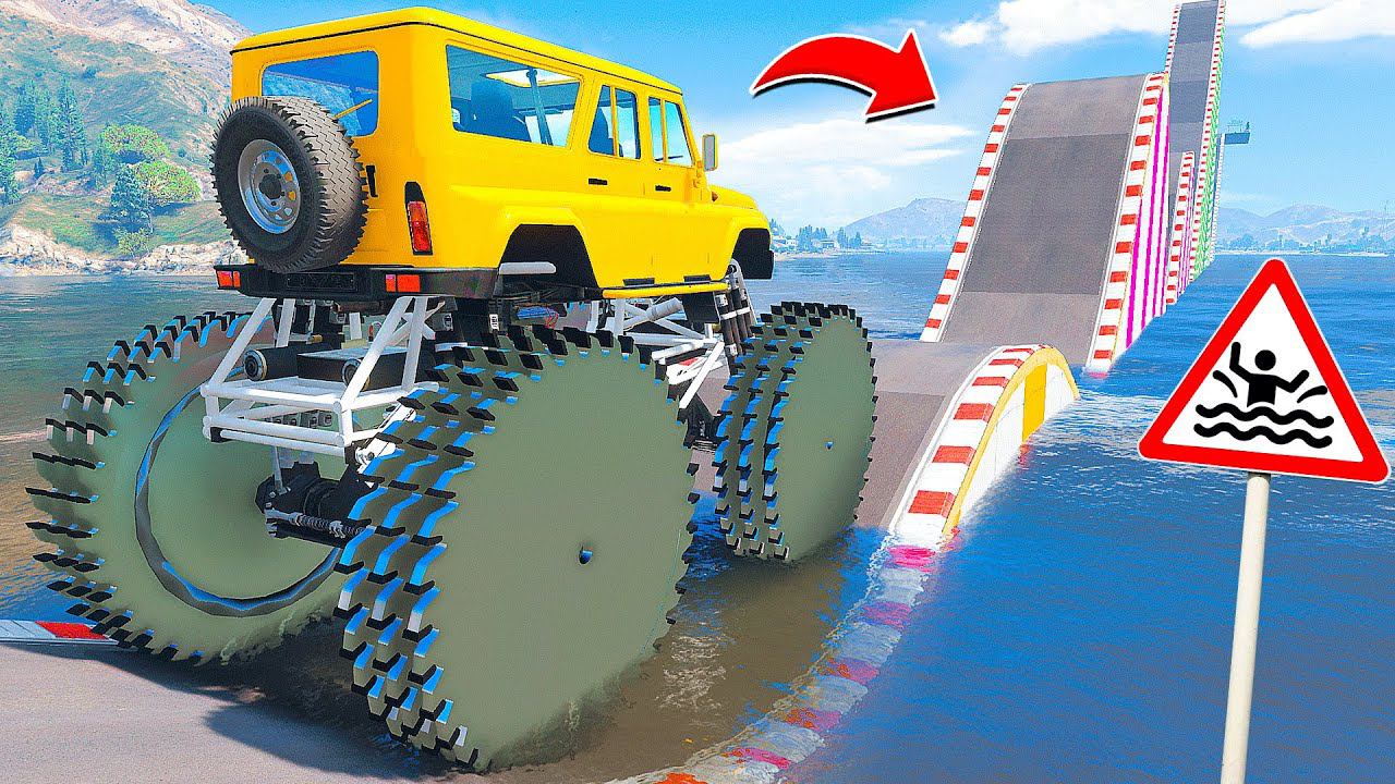 СМОЖЕТ ЛИ ГИГАНТСКИЙ УАЗИК С ПИЛАМИ ПРОЕХАТЬ ВОДНЫЕ ТРАМПЛИНЫ ГТА 5 МОДЫ - ЭКСПЕРИМЕНТЫ в GTA 5 MODS
