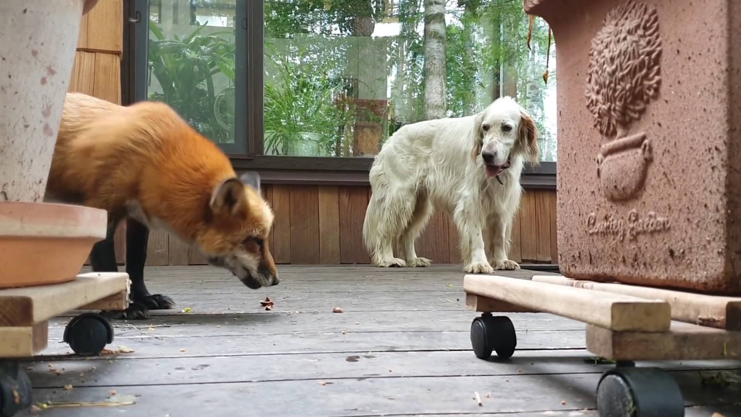 Лиса-Алиса. Собаки наблюдают за лисой, которая ест орехи