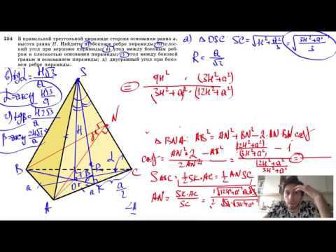 №254. В правильной Треугольной пирамиде сторона основания равна а, высота равна Н. Найдите: а) боковое ребро пирамиды; б) плоский угол при вершине пирамиды; в) угол между боковым ребром и плоскостью основания пирамиды; г) угол между боковой гранью и основанием пирамиды; д) двугранный угол при боковом ребре пирамиды. Поддержать канал рублём - 5469400944002125 (Сбербанк) Мой второй канал для подготовки к ЕГЭ и ОГЭ - https://www.youtube.com/ЕвгенийСумин Инстаграм - https://www.instagram.com/EGE_OGE.math Личный инстаграм - https://www.instagram.com/ee_sumin VK - https://vk.com/evgeniysumin FB - https://www.facebook.com/EvgeniySumin
