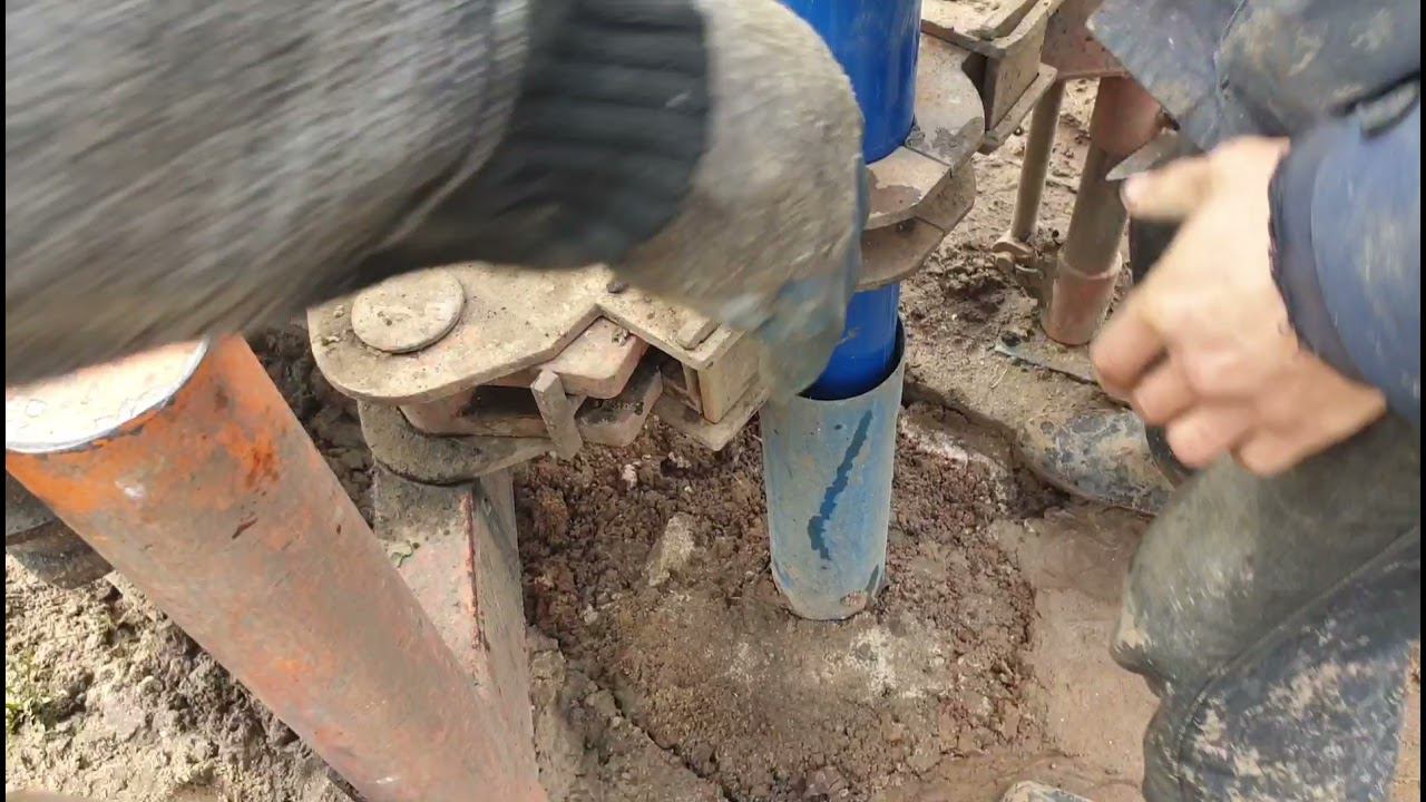 Процесс обсадки скважины пластиковыми трубами на малогабаритной буровой.