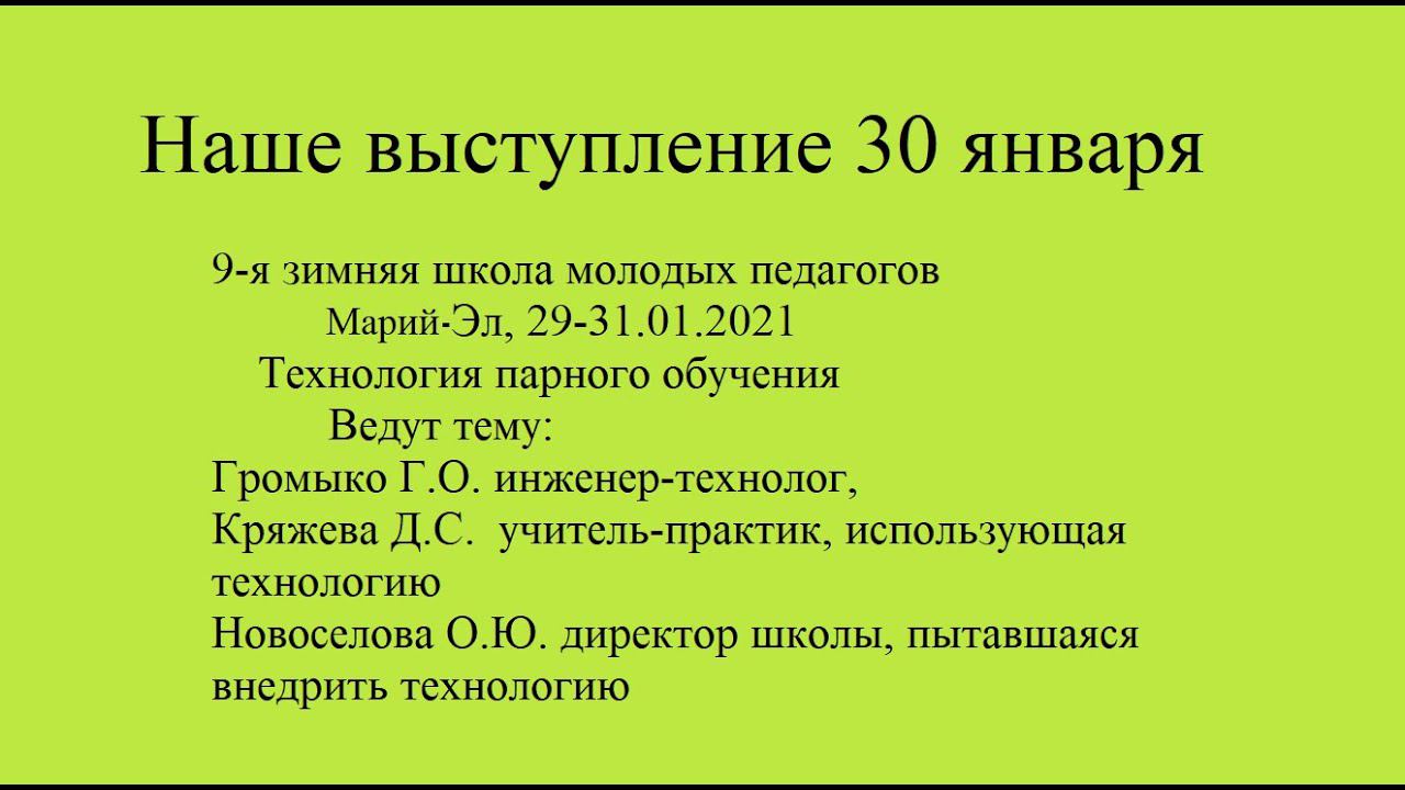 30.01.21 - наше выступление на школе Ведут тему: Громыко Г.О. инженер-технолог; Кряжева Д.С. , учитель-практик, использующий технологию; Новоселова О.Ю., директор школы, попытавшаяся использовать технологию. === Встреча с Игорем Донченко "Дети учат детей" от 21.01.2021 - 1:19:05 - https://youtu.be/Zr5-5L1aDek === Навигатор Семейного Образования 280 подписчиков СОС (семейная образовательная среда) - проект "Навигатора СО" для всех, кому важно качественное образование. Это вебинары, где мы обсуждаем разные аспекты альтернативного образования - по средам в 19-00 (время московское). 20 января 2021 года, прошла встреча на тему: "Дети учат детей - парное взаимное онлайн обучение, - как организовать весело и результативно?" Вы мечтаете о том, чтобы ваш ребёнок учился сам? и что же? - получается ли у вас это сделать? чему лично Вы сами в настоящее время учитесь? В первой части встречи каждый участник рассказал нам всем “что получается, а что не получается? что реально, а что лишь несбыточная мечта?”. Во второй части на вопросы ответил Григорий Громыко, - инженер-технолог по технологии парного обучения. Практика и оргвопросы по парной технологии: Объясняшки, - 2:32 - https://youtu.be/mh8jLyjLilg 2:13 - https://youtu.be/hvVDyQVMZ9I Для родителей - 1:26 - https://youtu.be/XM-RZz0-1Nk Для учителей - 2:02 - https://youtu.be/IFKODC6JP1w === Работа в парах - русский язык Ситдикова Фаиля Мусиевна - 7:18 - https://youtu.be/DbrlzmRCGJ0 Парное обучение - из первых рук и уст! Джамиля Кряжева - учитель географии - 26:26 - https://youtu.be/vMHFBbFbECs Парное обучение в начальной школе в Германии - 9:31 - https://youtu.be/cGUpbmUYkUY Парное обучение в школе, Красноярск - 11:49 - https://youtu.be/cGUpbmUYkUY === ВКонтакте--группа - Технология работы в парах https://vk.com/club21598670 Фэйсбук-группа - Технология парного обучения https://www.facebook.com/groups/tehpa... Парное обучение - документальные фильмы - плэйлист - https://www.youtube.com/playlist?list... Описание технологии - http://www.paarschool.com/7obuch/trp.php === Связаться с Громыко Григорий Олегович можно так - https://www.facebook.com/grigorij.gro... или https://vk.com/id23067191 Оргпроект темы 1. Вопрос-ответ Ведущие заранее составляют список вопросов друг к другу и публикуют их здесь, например, - Громыко=Новосёлова - после педсовета в парах (31:32) какая практика технологии получилась на сегодня? Громыко=Кряжева - есть ли сейчас у вас практика технологии очно? Громыко=Кряжева - есть ли сейчас у вас практика технологии онлайн? 2. Д/з для участников Заранее посмотреть видео (15:15) и задать вопросы здесь - вопросы именно к содержанию видео, пожалуйста. Вопросы пишите в коментах к видео. === Видое, упомянутые в разговоре - Парное взаимное обучение Работа в парах - русский язык Ситдикова Фаиля Мусиевна - 7:18 - https://youtu.be/DbrlzmRCGJ0 Парное обучение - из первых рук и уст! Джамиля Кряжева - учитель географии - 26:26 - https://youtu.be/vMHFBbFbECs Парное обучение в начальной школе в Германии - 9:31 - https://youtu.be/cGUpbmUYkUY Парное обучение в школе, Красноярск - 11:49 - https://youtu.be/cGUpbmUYkUY === Связаться с Громыко Григорий Олегович можно так - https://www.facebook.com/grigorij.gromyko или https://vk.com/id23067191 === Работа в парах, Технология парного обучения, Алгоритм работы в парах, ЭкоСеть, Школа Радости, Громыко Григорий Олегович, Навигатор образования