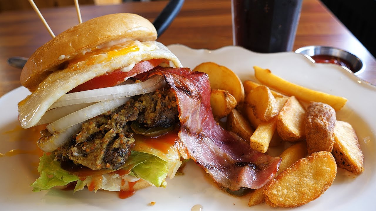 Приготовление бургеров с беконом, яйцом, говядиной - корейская уличная еда.