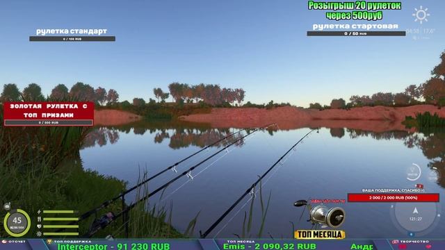 Поддержка донатом https://www.donationalerts.com/r/kalyamba11 Альтернативный донат https://new.donatepay.ru/@1032463 Если стрим лагает,смотри стрим на трово https://trovo.live/s/Kalyamba_na_Ribalke ТОП 1 ДОНАТЕР МЕСЯЦА поддерживающий трансляции получит подарок в виде катушки TAIGA c40 2s Мой ВК - https://vk.com/kalyantv НИК в игре kalyan11 НАШ ДИСКОРД СЕРВЕР https://discord.gg/mSbnTJK8TB Заказ водоема на 1 час - 500р ( весь стрим 2500р ) Модерка на канале 1100р ( каждая следующая на 100р больше) Озвучка доната на 40р,50р,100р,200р,300р,500р,1000р ✅Призы в рулетке "ЗОЛОТАЯ" ✔ ЗОЛОТО ✔ ПРЕМ ✔ КАТУШКИ РАПТОР 40, АЗИМУТ 10000, СИЛЬВЕР 80, ТАЙГА с 30 ЮБИЛЕЙНАЯ, ✔ ПАЛКИ ПИЛКЕРНАЯ, ДОНКА МОРСКИЕ, ✔ РОД ПОД, СТУЛЬЯ ✅Призы в рулетке СТАНДАРТ : ✔ катушка "РАПТОР 40" ✔ катушка "АЗИМУТ 10000" ✔ катушка "ТАЙГА С30, С40, С30 (юбилейная)" ✔ катушки 60 для медного ( ЭВИИ, НАТОРЫ, ГОЛДА, и тд) ✔ ПИЛКЕРНОЕ УДИЛИЩЕ КОРОЛЕВА ОКЕАНА ✔ Морское Донное удилище ✔ прем ( 3, 7, 30 дней) ✔ золото ( 1, 3, 5, 10, 20 ,50) ✔ билет на море ( 1, 3, 5 дней) ✔ голд наживка и др. ✅Призы в рулетке "СТАРТОВАЯ" ✔ катушка "silver80" ✔ катушка "БЕЛЫЙ КАЛИБР" ✔ катушка "Черный калибр" ✔ катушка "Протон" ✔ катушка "Нарга 6000" ✔ Набор Фидерист и спинингист ✔ Карповик Фортуна ✔ фидерные удилища ✔ прем, золото, алкашка, наживки и тд P.s Рулетка это не казино, а награда за поддержку стримера. Вечный ТОП ПОДДЕРЖКИ (11.05.2024) 1. Dimon_pokemonchik 119 784 2. Interceptor 75 508 3. Skreb79 71 261 4. une personne 68 619 5. Нарвал77 31 550