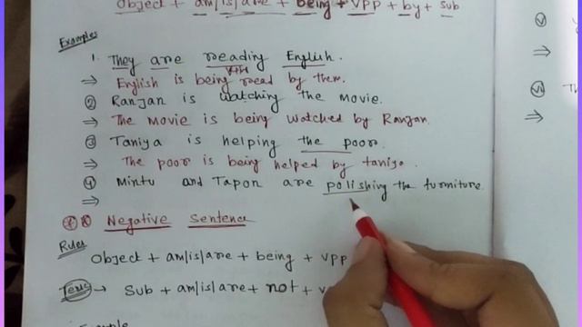 Passive sentences in the present continuous tense have the following structure: Object of the active sentence + am/is/ are + being + past participle form of the verb+ by+ subject of the active sentence.. It is important for all competitive Exams..