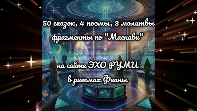 Сайт "Эхо Руми" https://sites.google.com/view/ehorumi/ На сайте представлены поэтические переложения "Маснави", реминисценции по сюжетам сказок и поэм, молитв и изречений Джалалуддина Руми, электронные книги Феаны, посвящённые суфийской мудрости. Любовь - чужестранка в обоих мирах, В ней бездны безумства, триумфы и крах... Но мир проявляет лишь тень, отраженья, И семьдесят два элемента круженья... Иная религия Света, Любви, Чем церкви земные, чем книги Земли... - Служение - цепи, владычество - сроки, А разум пред Нею… лишь учит уроки... Твой разум не в силах постигнуть небытье. Любовь - это море мирского забытья. Меж тем, что есть власть и служенье - Она! Влюблённого путь - это бездна без дна... МОРЕ РУМИ - на сайте Семь Морей https://sseas7.narod.ru/rumi.htm Проект "Галактический Ковчег"