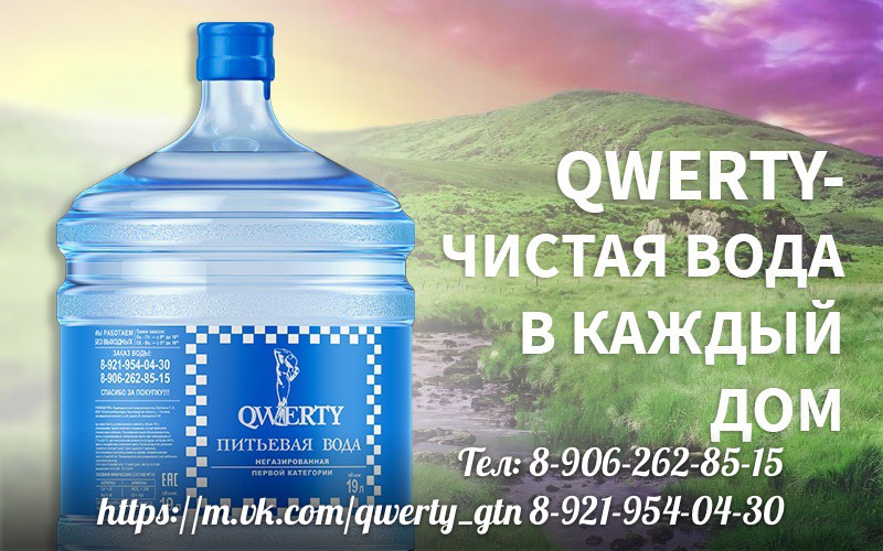 Компания QWERTY занимается продажей чистой питьевой воды и осуществляет бесплатную доставку. Работаем по Гатчине и Гатчинскому району, а также Санкт-Петербургу и Ленинградской области. Доставка осуществляется в квартиры, офисы, медицинские учреждения, производственные предприятия, салоны красоты, фитнес-клубы, в любое удобное для Вас время! QWERTY - это вода премиум класса, которую выбирают за отличное качество и низкую цену. В наших магазинах имеется большой выбор кулеров, диспенсеров, помп, фильтров и множество других товаров. Кроме этого, наша компания, единственная в Гатчине, осуществляет ремонт и чистку кулеров. Клиенты нашей компании могут быть уверены в лучших условиях доставки и сервиса. Пейте чистую воду и будьте здоровы! Адреса магазинов: Ленинградская обл., г. Гатчина, ул. Карла Маркса 12-а Гатчинский район, д. Большие Колпаны, ул. 30 лет Победы, д. 1 Режим работы аквапунктов: с 10-00 до 20-00. Заказы принимаются с 9-00 до 19-00, в субботу и воскресенье с 9-00 до 16-00. Тел.: 8 (906) 262-85-15 Тел.: 8 (812) 954-04-30 Сайт: voda-gtn-lo.ru Группа Вконтакте: m.vk.com/qwerty_gtn