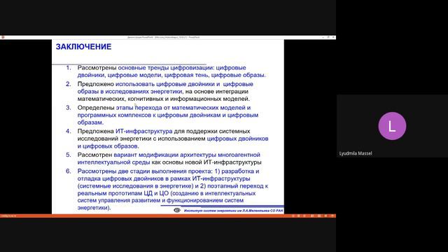 Докладчик: Л.В. Массель (ИСЭМ СО РАН, Иркутск) Тема: Использование научной ИТ-инфраструктуры исследований энергетики для построения цифровых теней и цифровых двойников объектов и систем энергетики