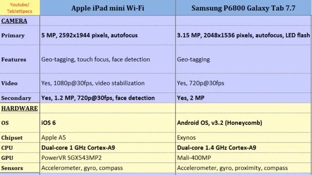 Apple iPad mini Wi-Fi to Samsung Galaxy Tab P6800 7.7, differences, specifications : iPad mini Wi-Fi Versus P6800 Galaxy Tab 7.7, Comparison of these phones on: Dual-core, 1 GHz Cortex-A9, 768 x 1024 pixels, 7.9 inches, Dual-core, 1.4 GHz Cortex-A9, 800 x 1280 pixels, 7.7 inches, Internal Memory, Battery Life, GPU, Network, Ram, Bluetooth more...
